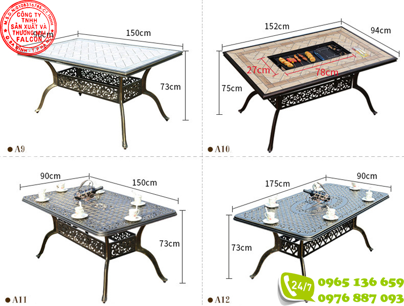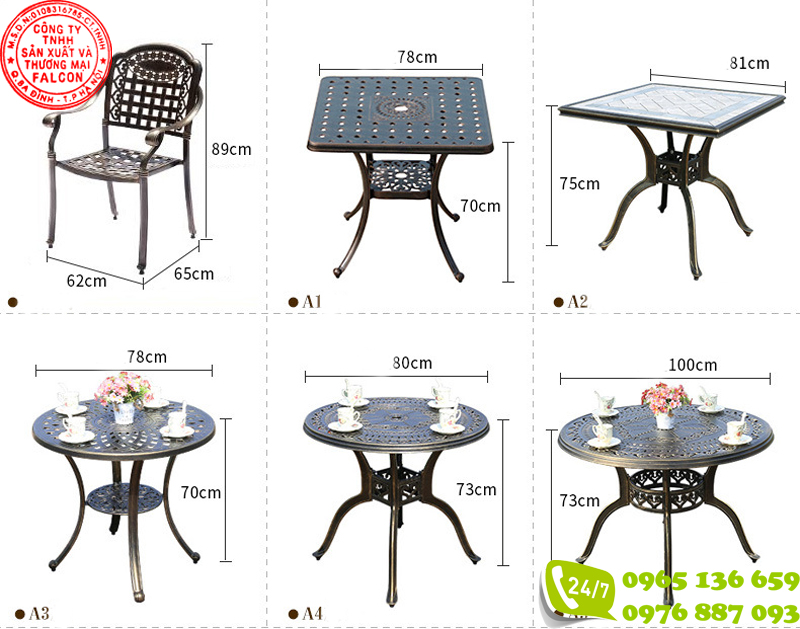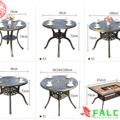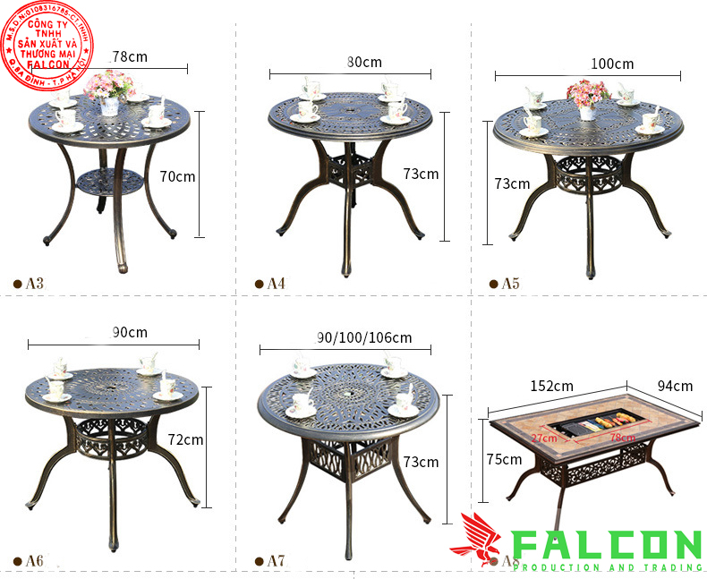 Bộ bàn ghế nhôm đúc được Falcon phân phối cung ứng ra thị trường đầy đủ mẫu mã, kích thước đa dạng thế nên khi khách hàng lựa chọn những sản phẩm bên Falcon thì thoải mái lựa chọn những mẫu mã phù hợp với không gian, địa điểm của khách sạn, resort, khu nghỉ dưỡng