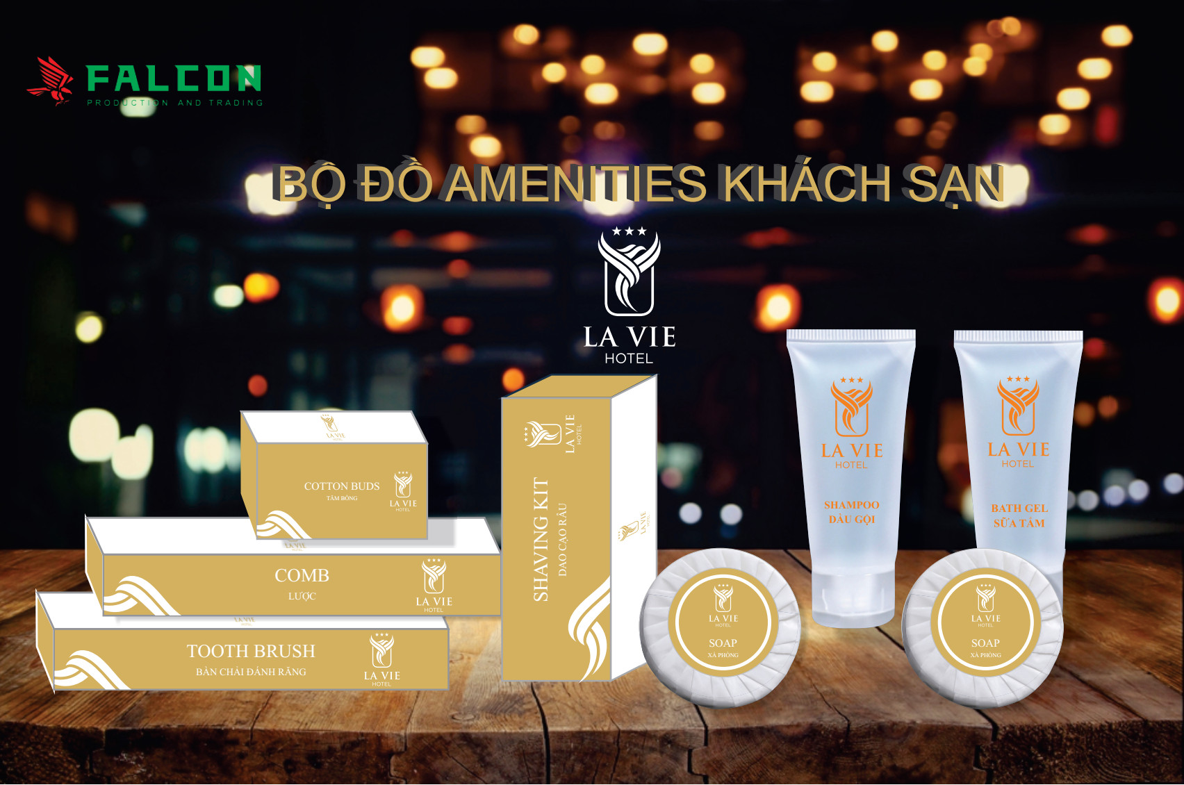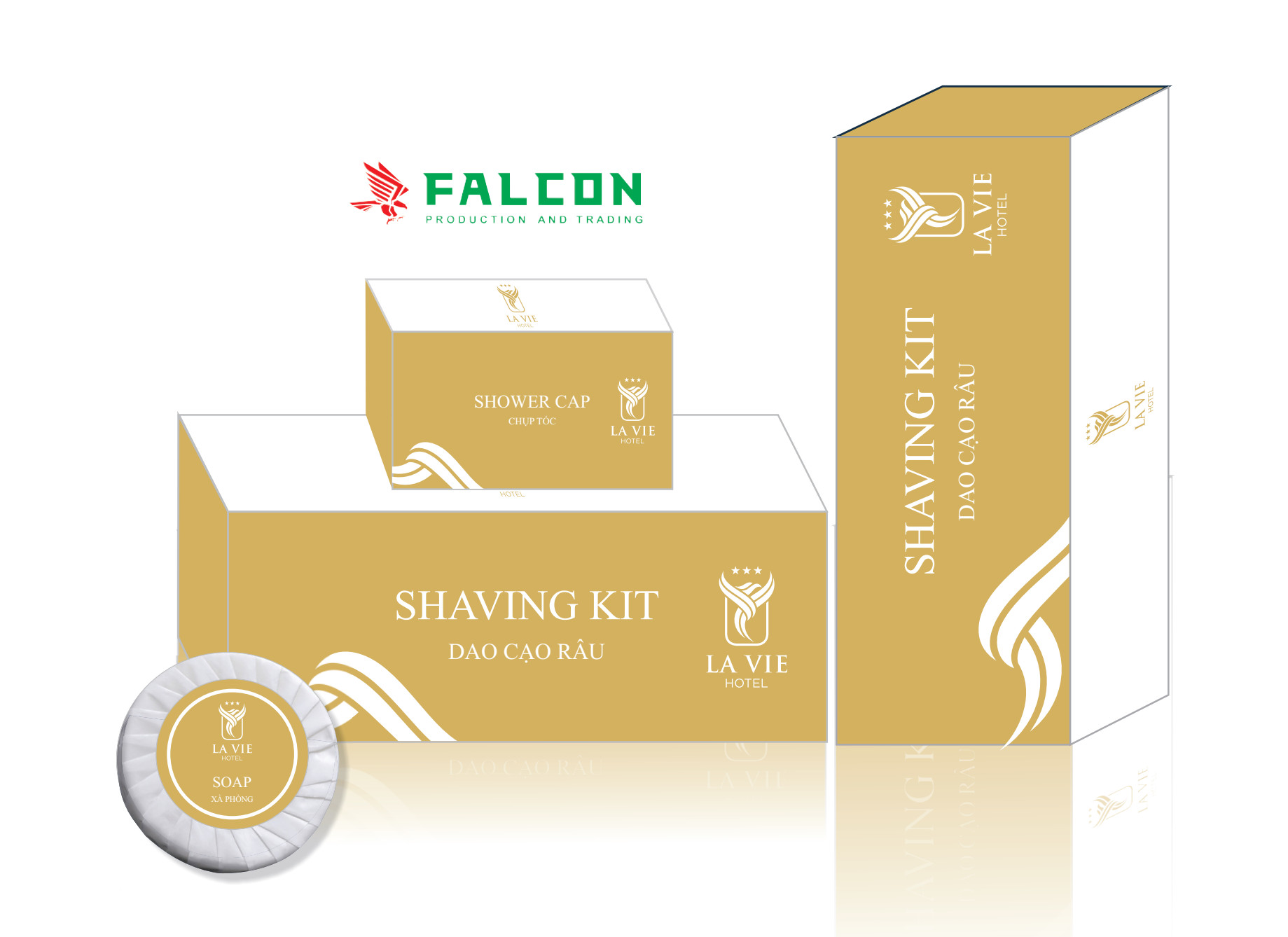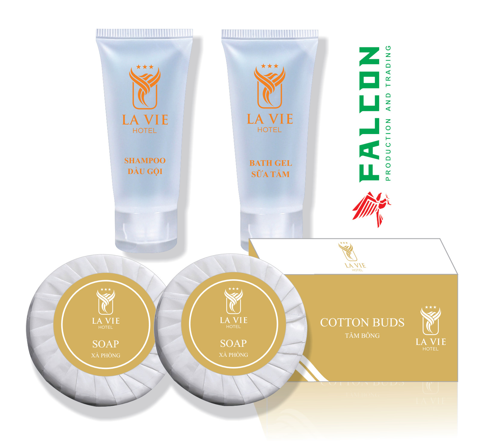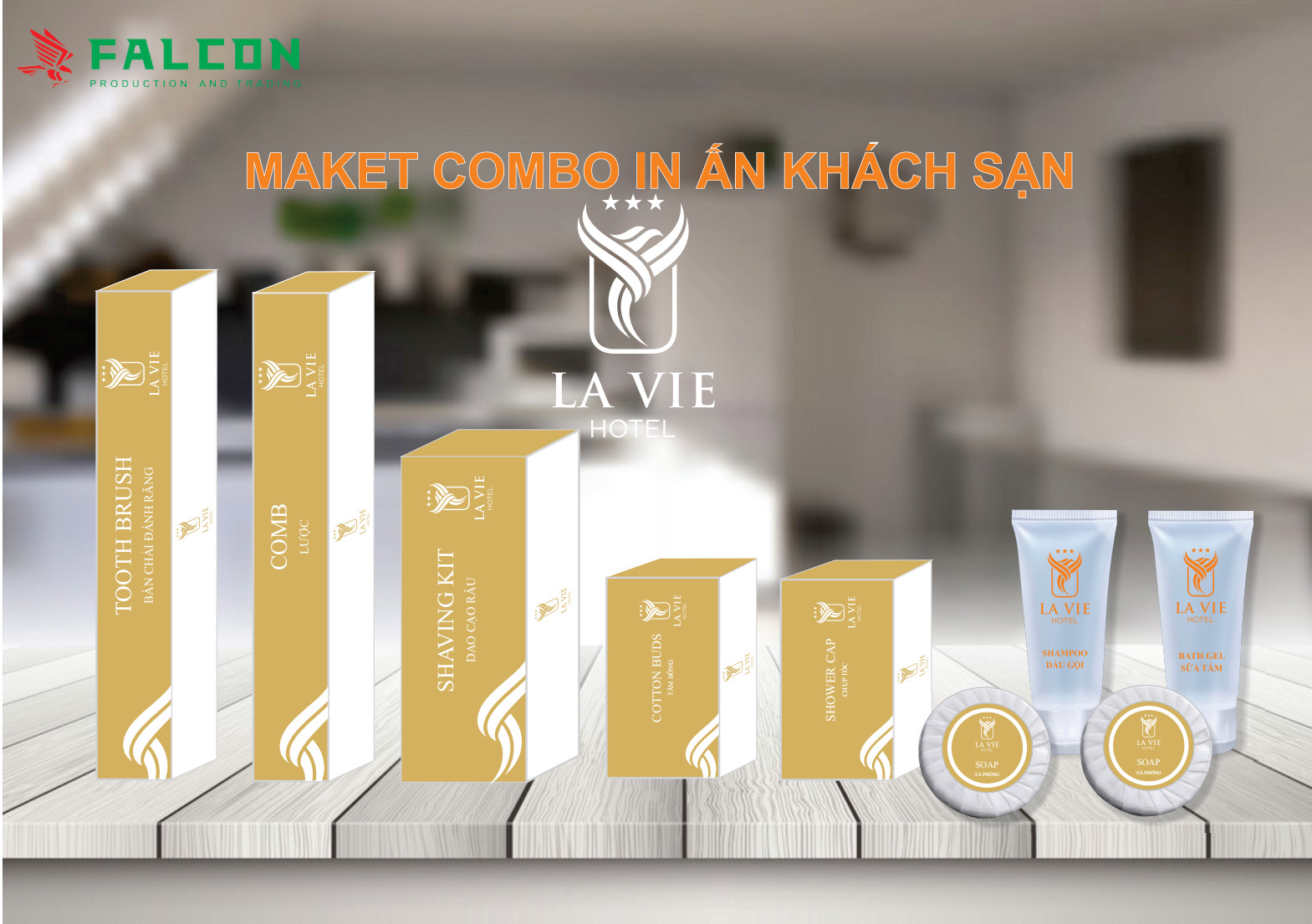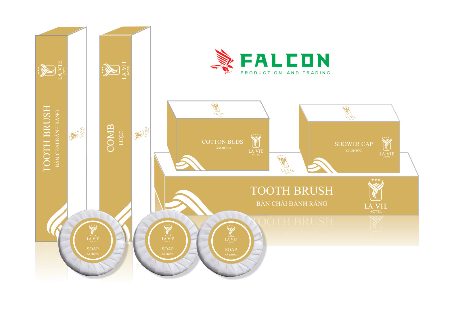 Công ty Falcon lên thiết kế in ấn bao bì vỏ hộp giấy đồ dùng khách sạn. Amenities khách sạn bao gồm: Bàn chải đánh răng, lược, dao cạo râu, tăm bông, chụp tóc, tuýp dầu gội. Hay sữa tắm, xà bông, bộ kim chỉ, bộ tẩy trang đầy đủ nhất. Tất cả các đồ dùng amenities tiêu hao sử dụng trong phòng khách sạn đều được nhận diện thương hiệu riêng.