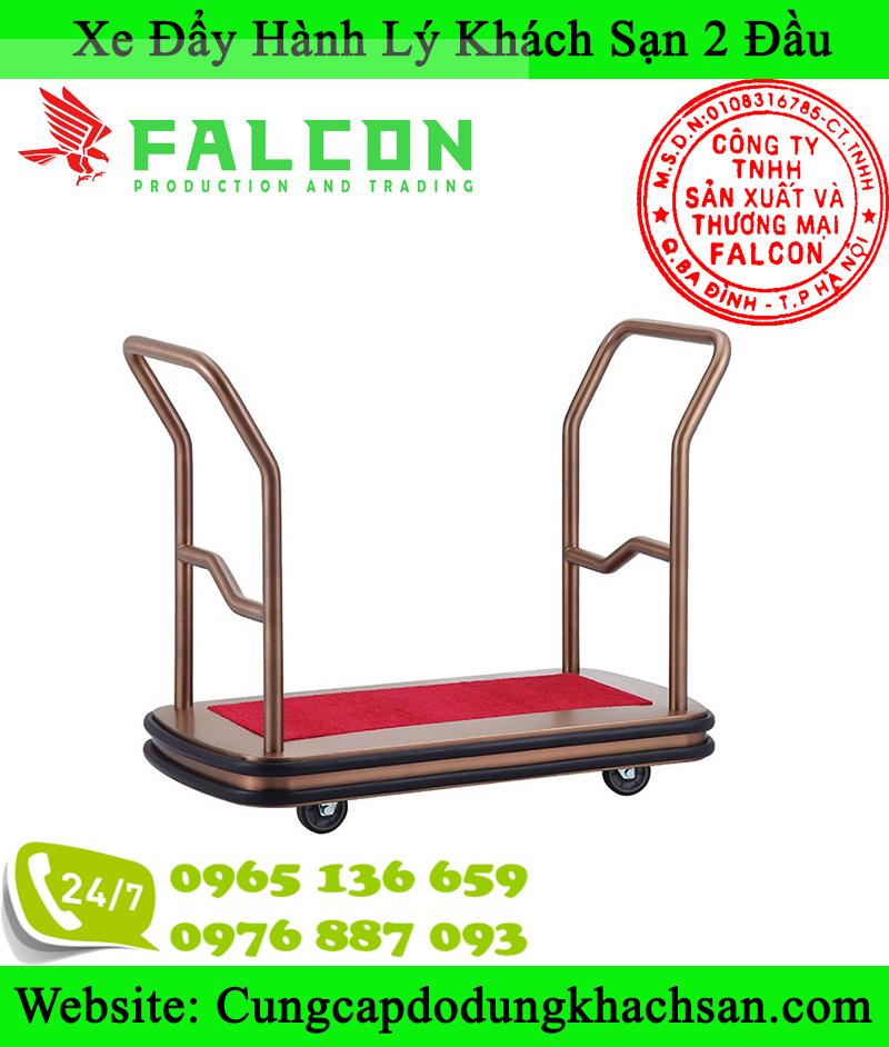 Xe đẩy hành lý 2 đầu mang thương hiệu falcon của chúng tôi là một sản phẩm đã được rất nhiều khách sạn, resort,khu nghỉ dưỡng cao cấp ti tưởng lựa chọn sử dụng. Phần khung xe được thiết kế 100% từ inox mạ vàng không gỉ..