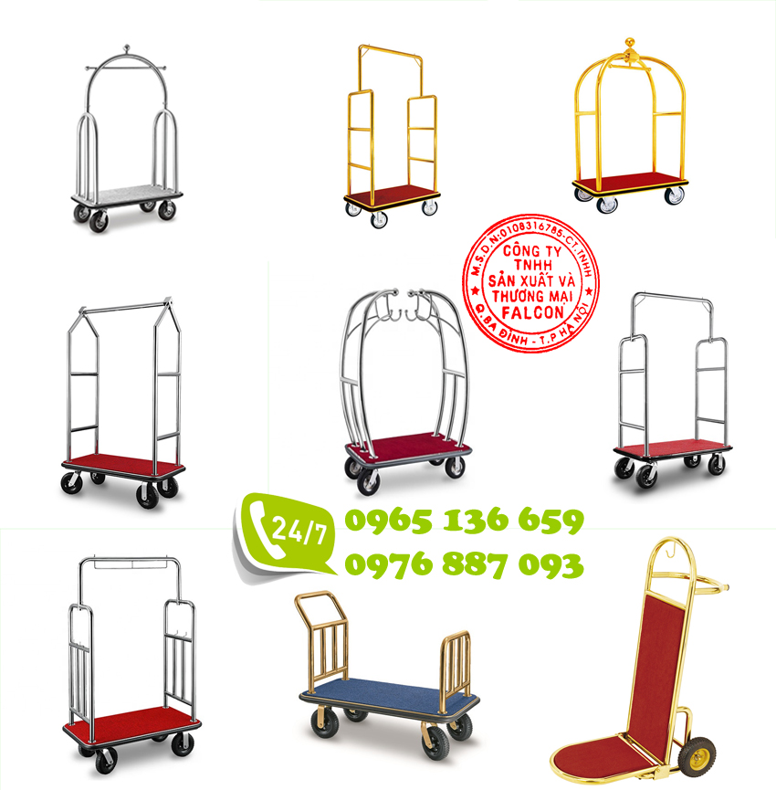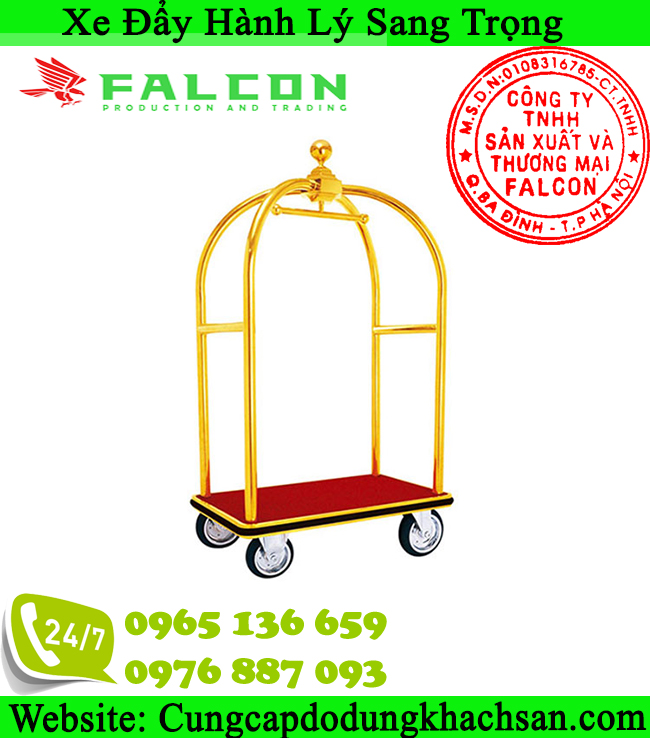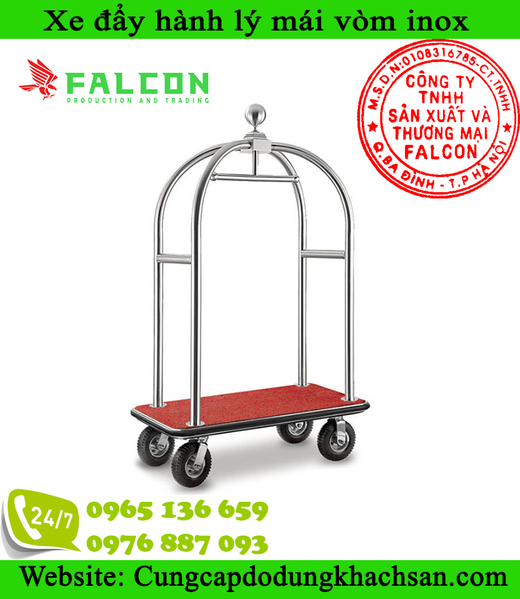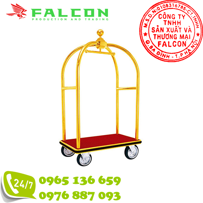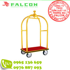 Xe đẩy hành lý mái vòm falcon đang được rất nhiều khách sạn, resort, sân bay, khu nghỉ dưỡng cao cấp tin tưởng và lựa chọn sử dụng. Bởi xe đẩy hành lý khách sạn mang thương hiệu falcon của chúng tôi được sản xuất và thiết kế 100% từ inox mạ vàng, mạ bạc cao cấp và được sơn một lớp sơn tĩnh điện, khung thân xe chắc chắn và vững chãi, tải trọng lớn lên đến 250kg